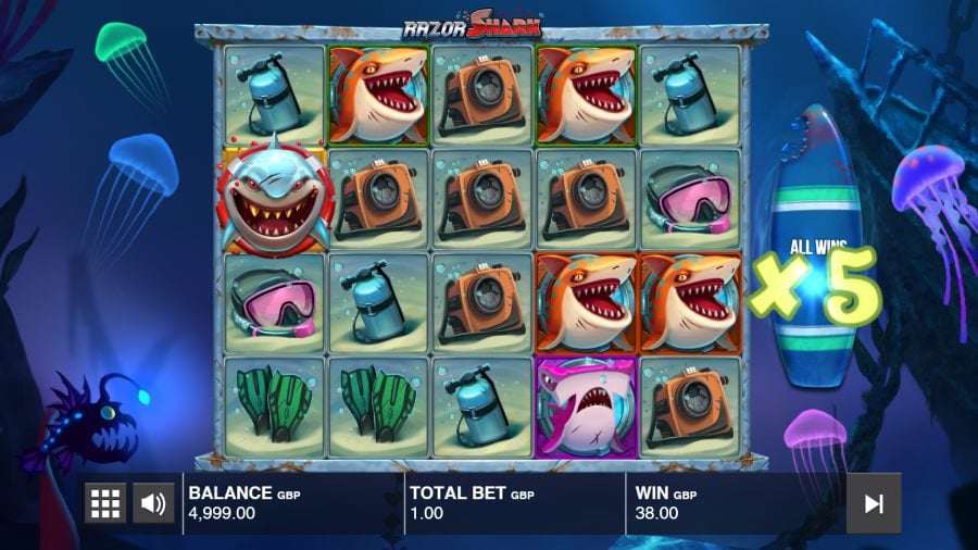 Några hajar som blir besvikna över den uteblivna maten kan vara hajarna i Razor Shark – med tanke på hur dykarutstyren ser ut i spelet kan man lockas att tro att dessa hajar har fått smak för tvåbenta varelser utan simhud mellan tårna. Denna slot innehåller en samling lite lätt skräckinjagande hajar, och en rad inte alls skräckinjagande – men mycket underhållande – funktioner. Till exempel kan du landa mystery stacks, gyllene hajar och respins. Denna slot kommer dessutom med en riktigt fin maxvinst, värd 85 475 gånger insatsen.