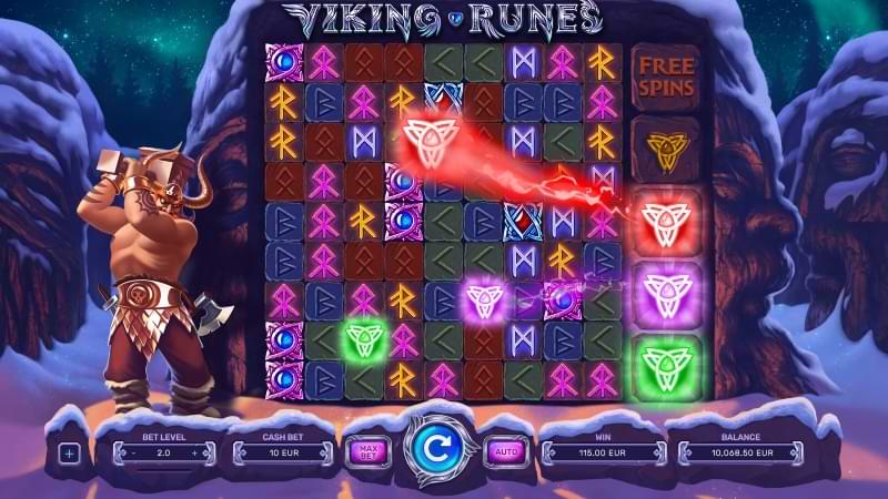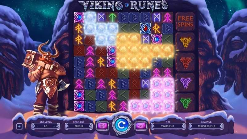 Istället för rullande hjul som hos traditionella slots hittar du kaskader i Viking Runes. Det sker i form av fallande block, där vinnande block exploderar och försvinner från hjulet. Det skapar utrymme för nya block att falla ner på samma spelrunda. Detta upprepas tills inga vinster finns kvar på spelplanen.